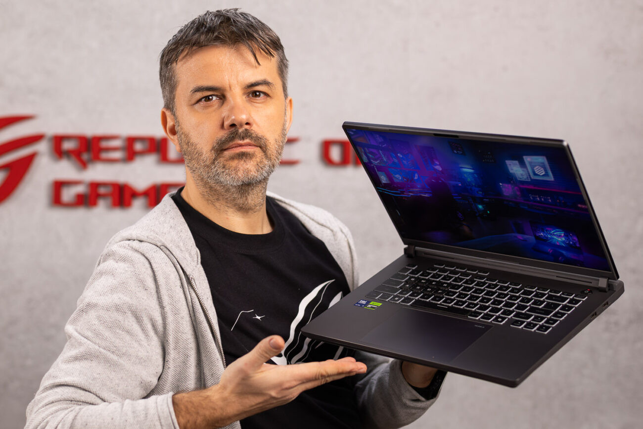 Modelul prezentat în video este ROG Strix G16 G615LW, cu ecran de 16 inchi. Față de varianta G18, acesta este mai compact și mai ușor de transportat, cântărind aproximativ 2,65 kg. Dimensiunile mai reduse nu vin cu limitări evidente de performanță, iar designul păstrează elementele vizuale consacrate: bara RGB pe tot perimetrul, aspectul „plutitor” pe birou și capacul metalic cu finisaj mat. Lipsește afișajul AniMe Vision de pe SCAR, dar structura carcasei și accesul rapid la interior sunt identice.